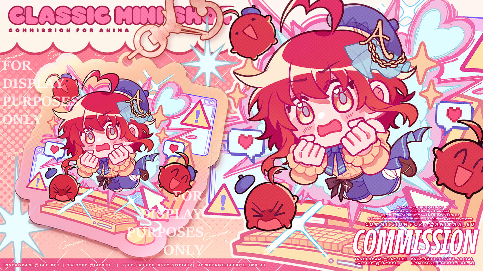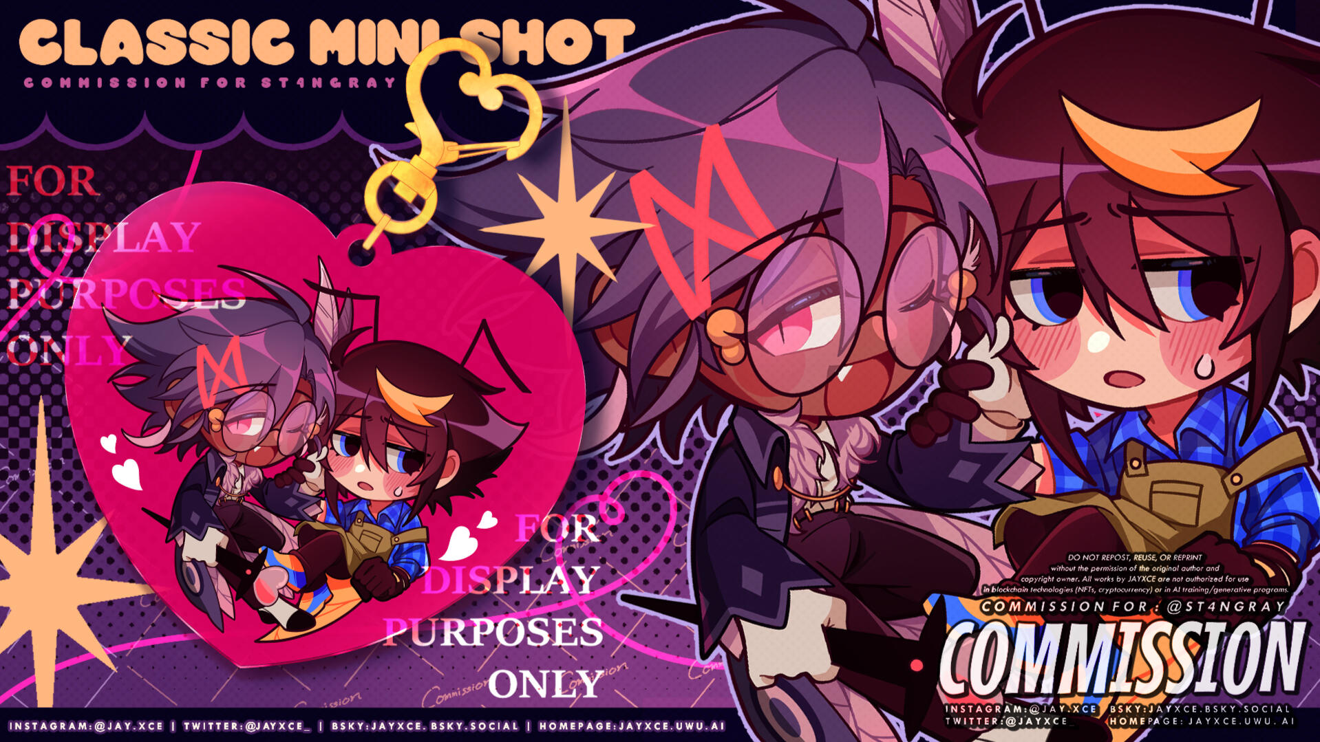 A chibi style with clean cell shading and simplified details, your characters will shine in their cutest form without feeling too overwhelming. You can include background props or tiny mascot companions to support your character, giving it that charming, petite splash art feel! Perfect for keychains, stickers, badges, or simply to add a little extra charm to your profile picture!